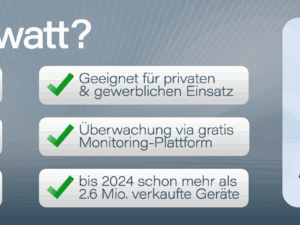 - Einspeiseleistung auf 600 W begrenzt (NEP 600) – genehmigungsfrei.